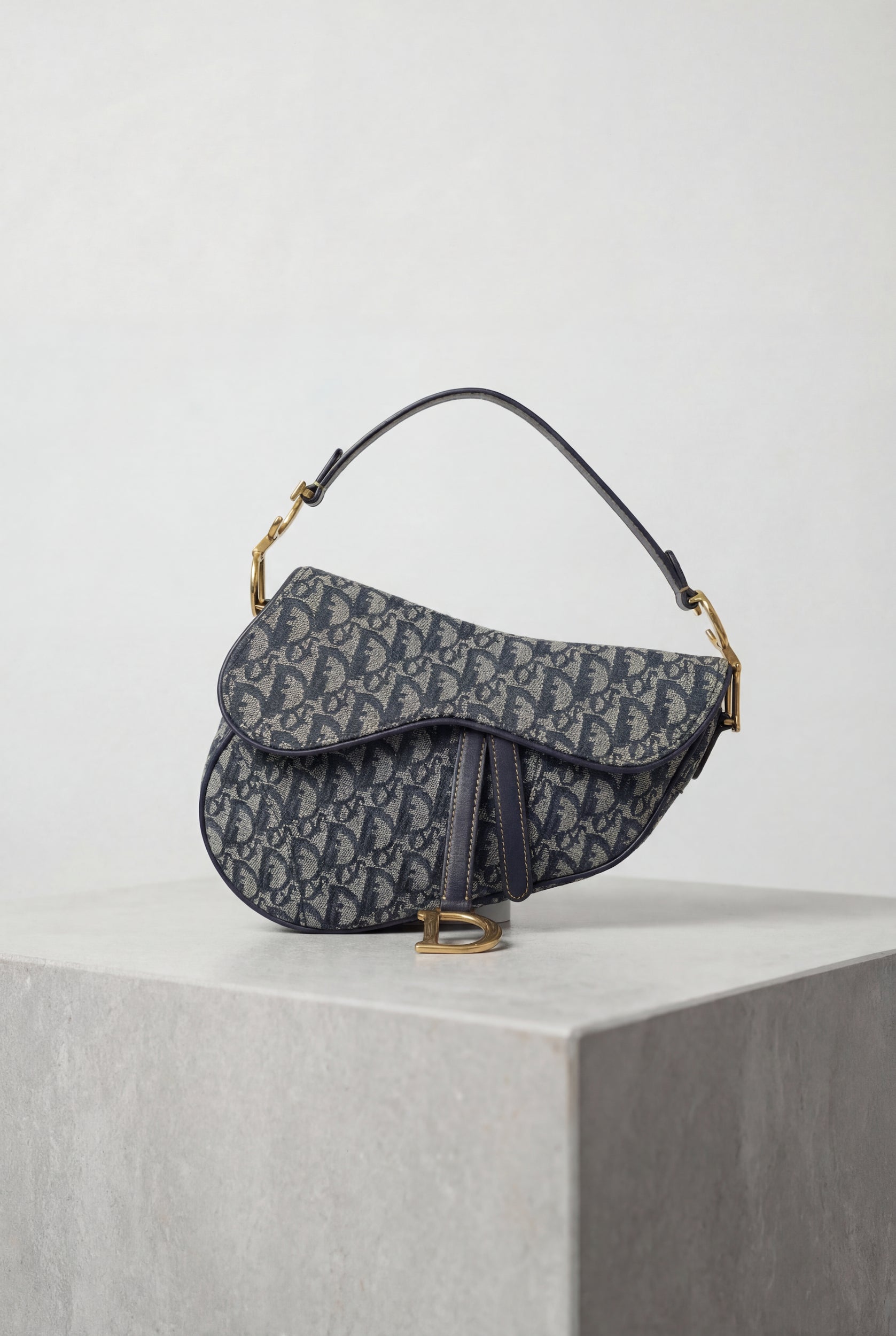 De iconische Dior Saddle Bag in het kenmerkende blauwe Oblique jacquard canvas. Oorspronkelijk ontworpen door John Galliano in 1999, is dit legendarische silhouet een van de meest herkenbare tassen in de modegeschiedenis geworden, met een grote revival in de afgelopen jaren.