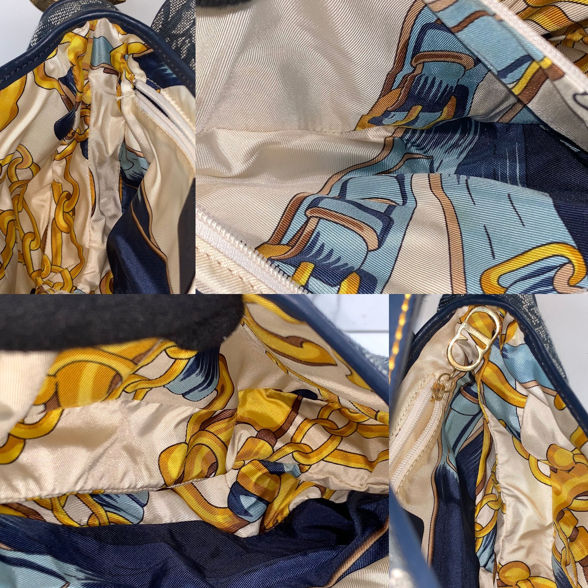De onderscheidende gebogen vorm heeft de kenmerkende 'D' stijgbeugel sluiting in antiek goudkleurig metaal en CD-initialen op de handgreep. Het interieur is bekleed met een prachtige zijden sjaalprint voering en bevat een ritsvak. Aan de achterzijde bevindt zich een extra steekzak. Een statement piece voor de Dior liefhebber.