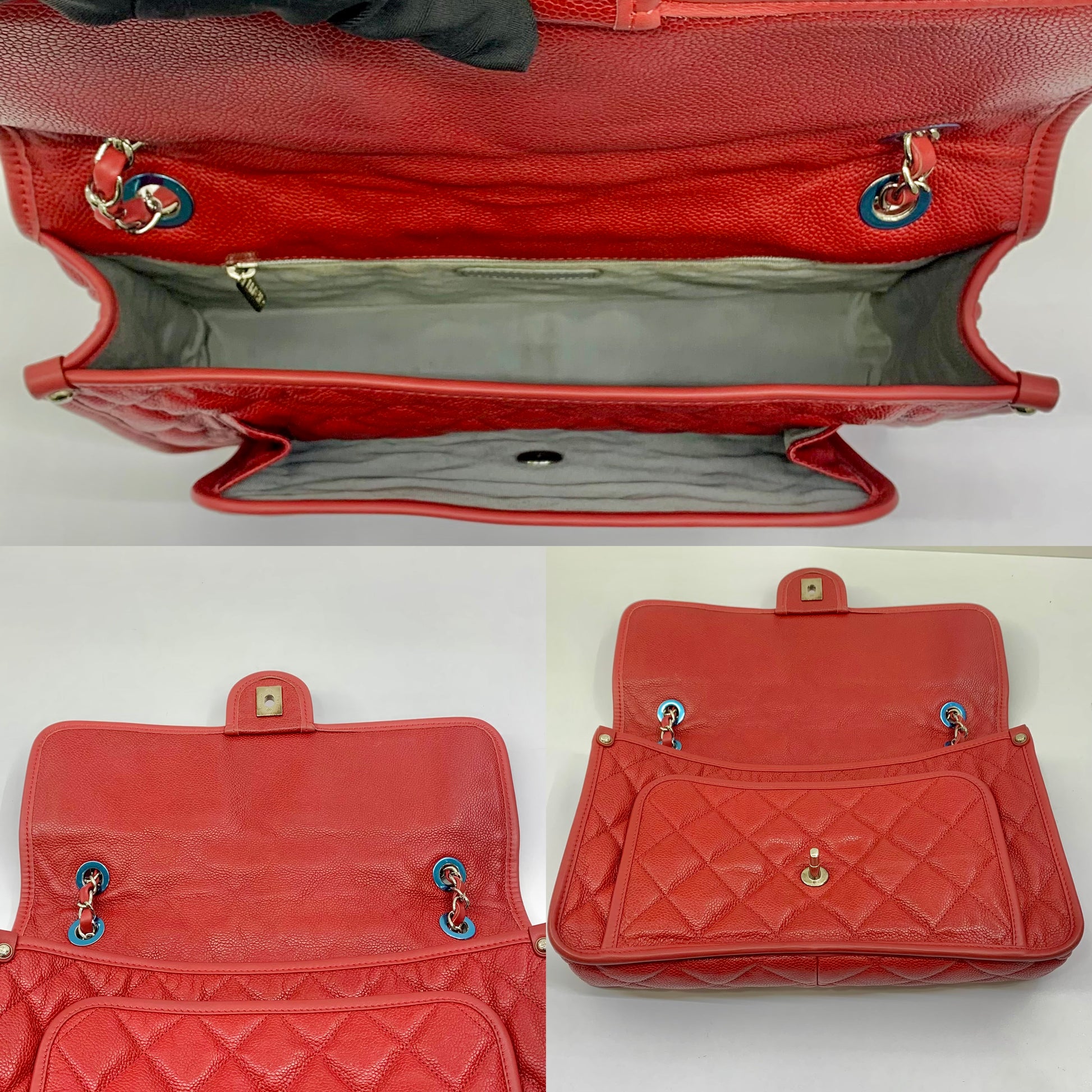 Een opvallende Chanel Up In The Air Flap Bag in prachtig rood caviar leer. Dit stuk uit de No.18 collectie (2018 Cruise) kenmerkt zich door het kenmerkende gewatteerde diamant patroon met contrasterende gladde leren rand. De zilverkleurige CC draaislot sluiting en de gevlochten ketting-leren schouderband maken dit een tijdloos Chanel icoon.