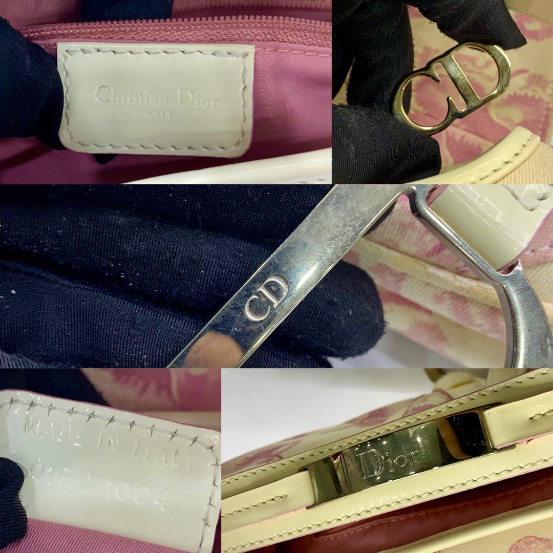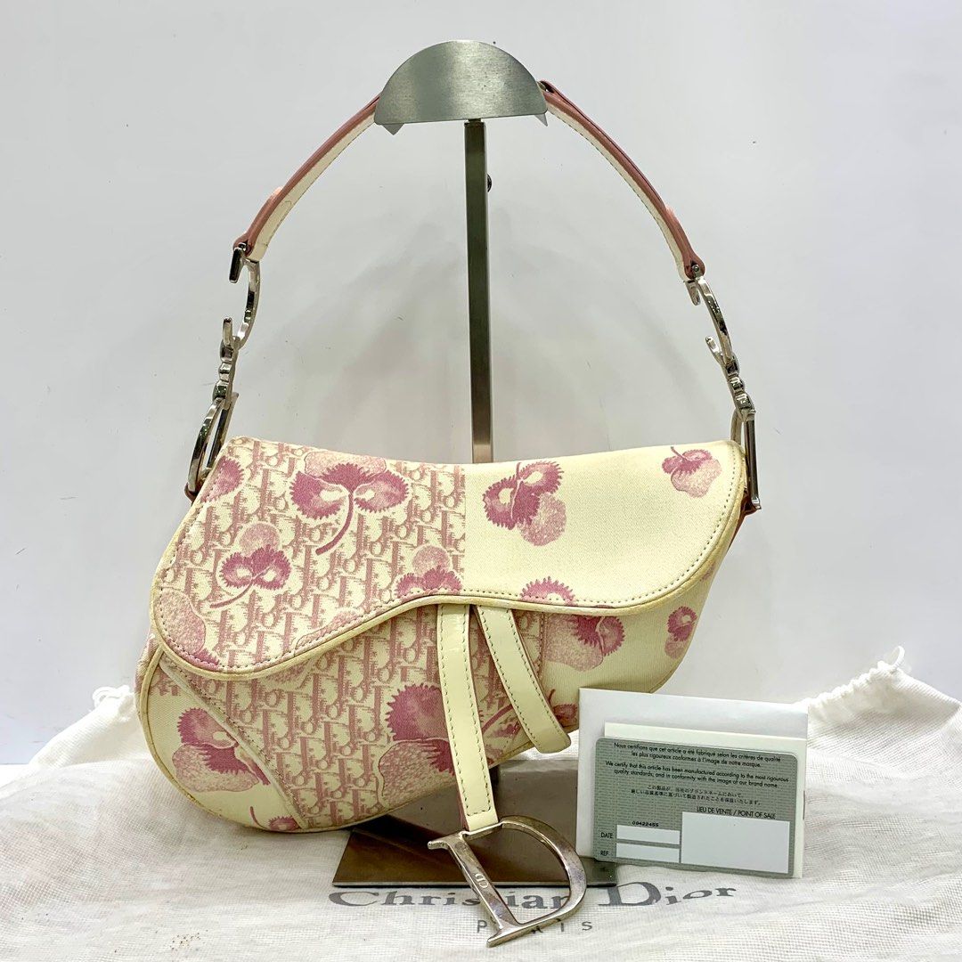 Een charmante Dior Trotter Flower Saddle Bag met het iconische zadelvormige silhouet in een prachtig crème canvas met roze bloemen Dior Oblique print. Dit vintage stuk toont de kenmerkende zadelvorm met zilverkleurige hardware en verstelbare schouderband.