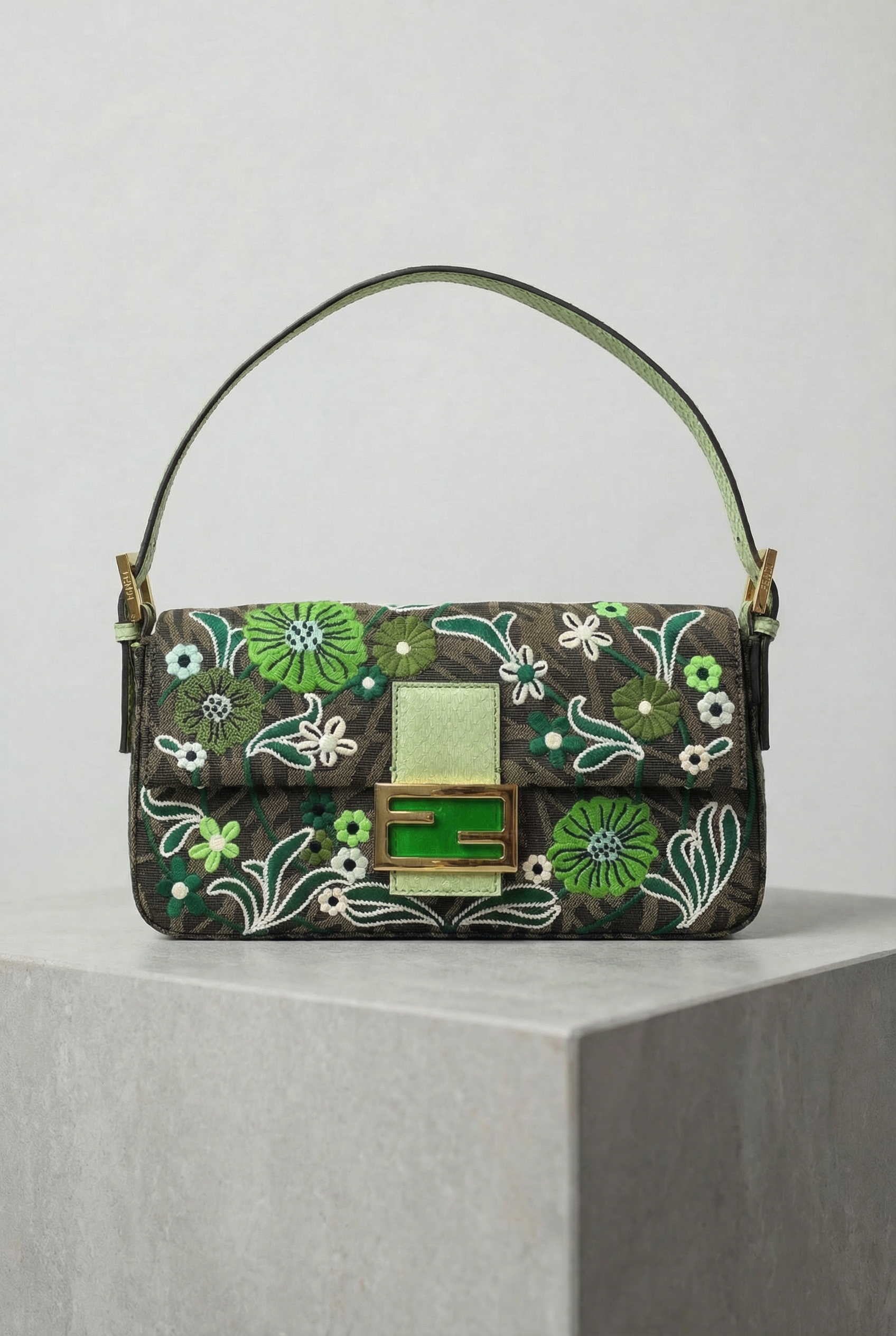 Een prachtige Fendi Baguette 1997 in het exclusieve FF Vertigo Jacquard met mooie groene bloemen borduurwerk. Dit limited edition stuk viert Fendi's iconische Baguette met het kenmerkende FF monogram patroon versierd met ingewikkeld bloemborduurwerk in groene en witte tinten.