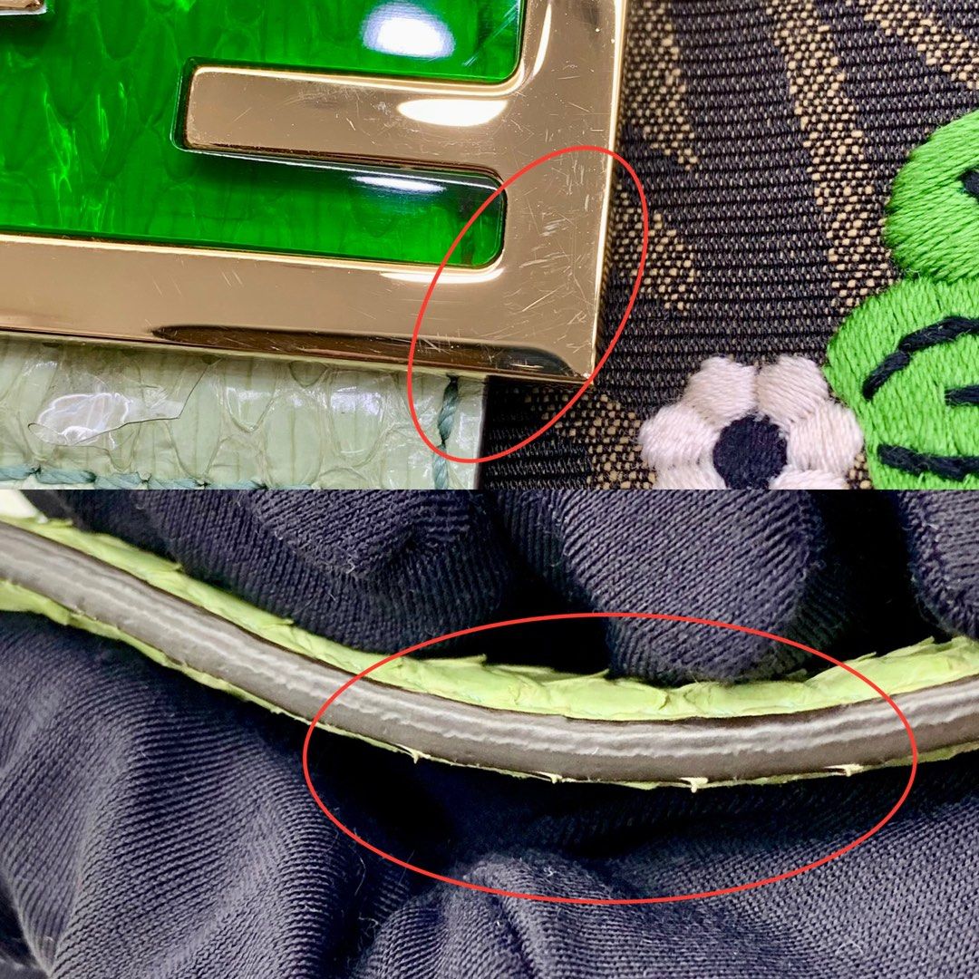 Heeft het klassieke Baguette silhouet met de kenmerkende FF gesp in groen email en goudkleurige hardware. De korte schouderband in groen leer maakt de look compleet. Opent naar een met stof gevoerd interieur.