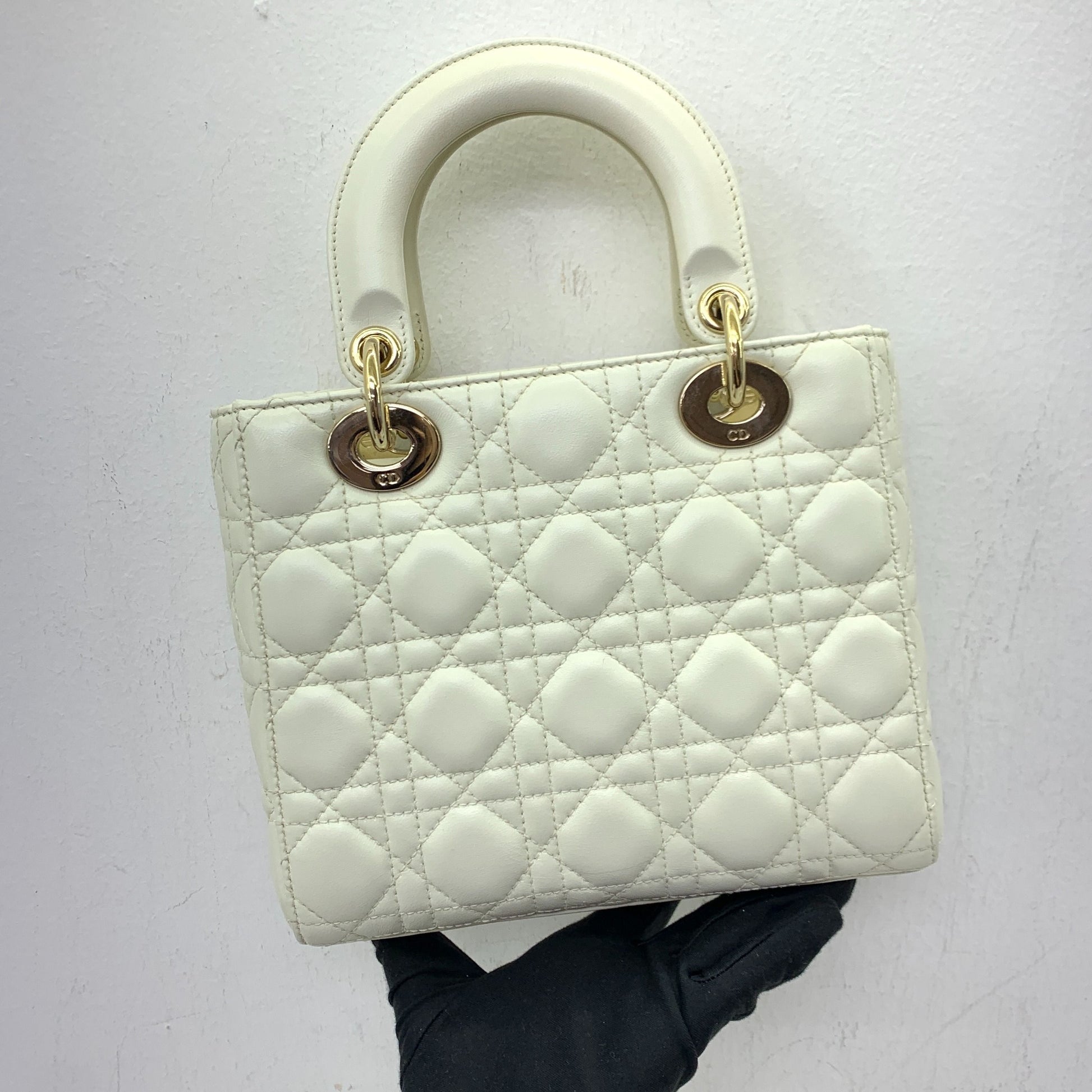 De iconische Lady Dior tas in prachtig wit lamsleer met het kenmerkende Cannage gewatteerde patroon. Deze Small versie straalt elegantie uit met de goudkleurige hardware en verfijnde afwerking.