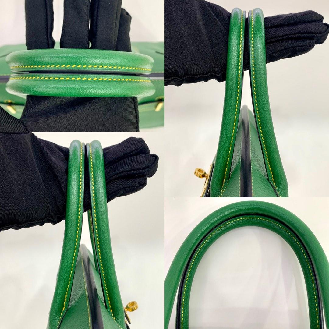 Een uitzonderlijke Hermès Birkin 30 in prachtig Vert Vertigo (levendig groen) Chèvre leer met gouden hardware. Dit special order stuk heeft het begeerde Chèvre (geitenleer) dat bekend staat om zijn duurzaamheid en mooie textuur, met contrasterende gele stiksels die een unieke touch toevoegen.