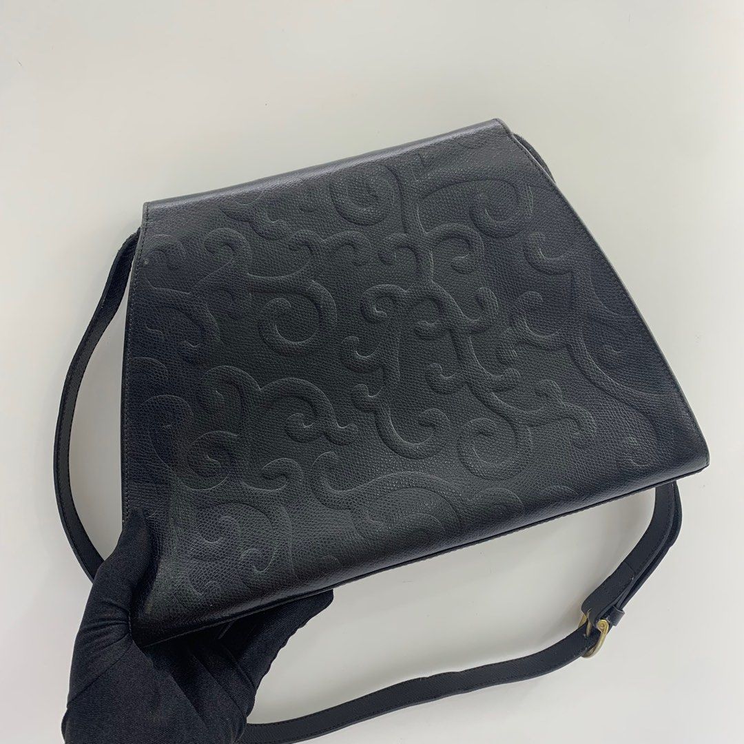 Een tijdloze vintage Yves Saint Laurent schoudertas in zwart gegraveerd leer met goudkleurige hardware. Deze prachtig vormgegeven tas valt op door het unieke rankenmotief en de kenmerkende trapezevorm.