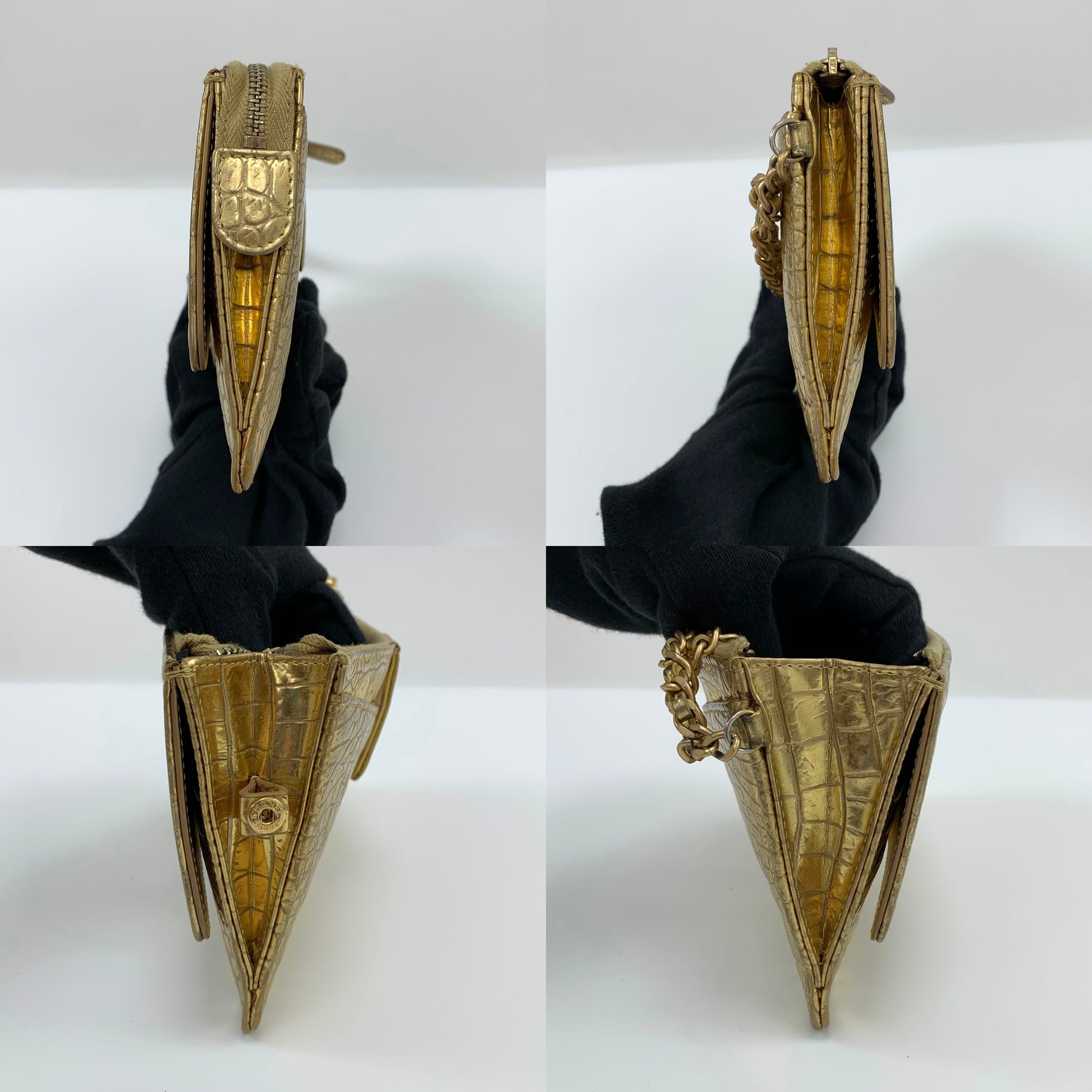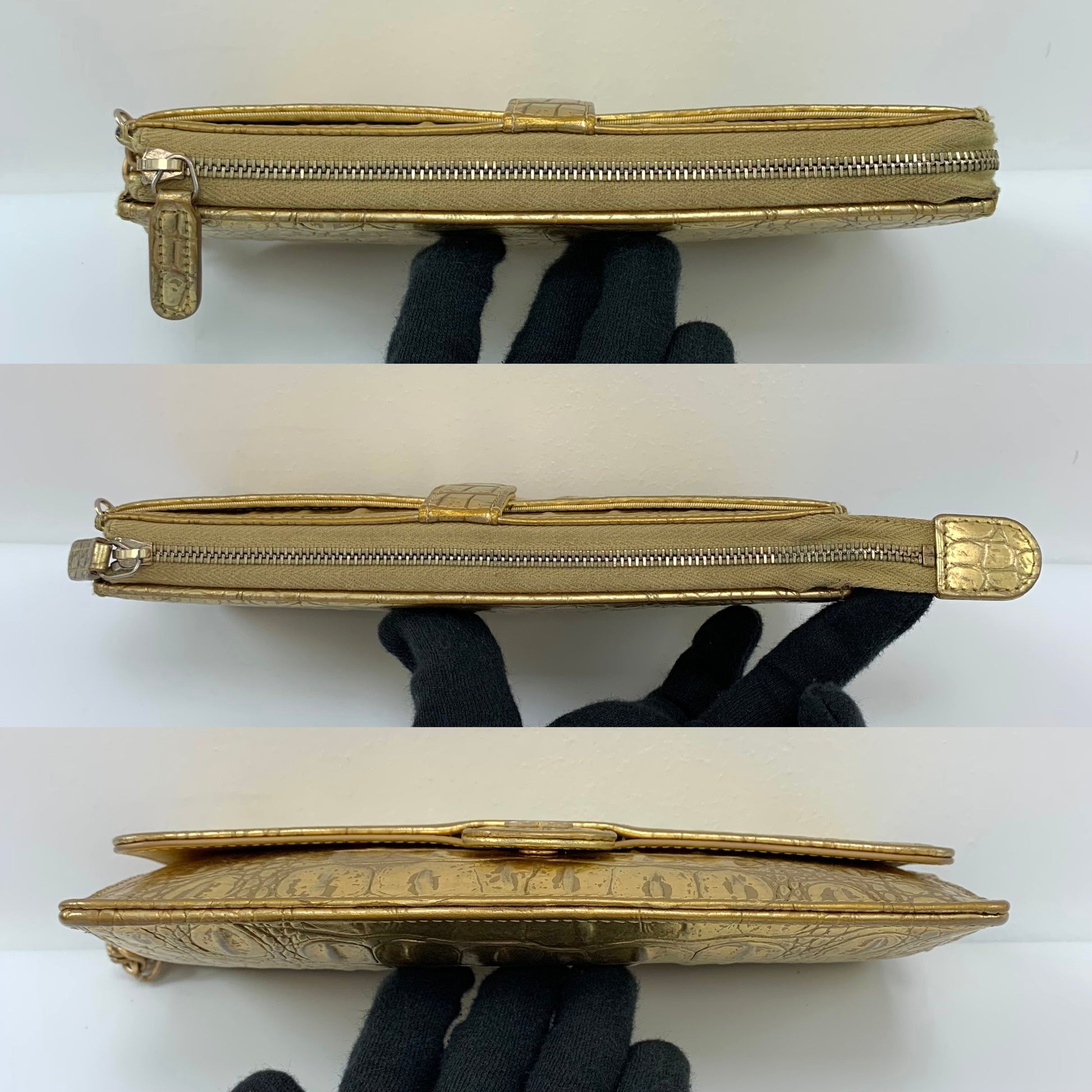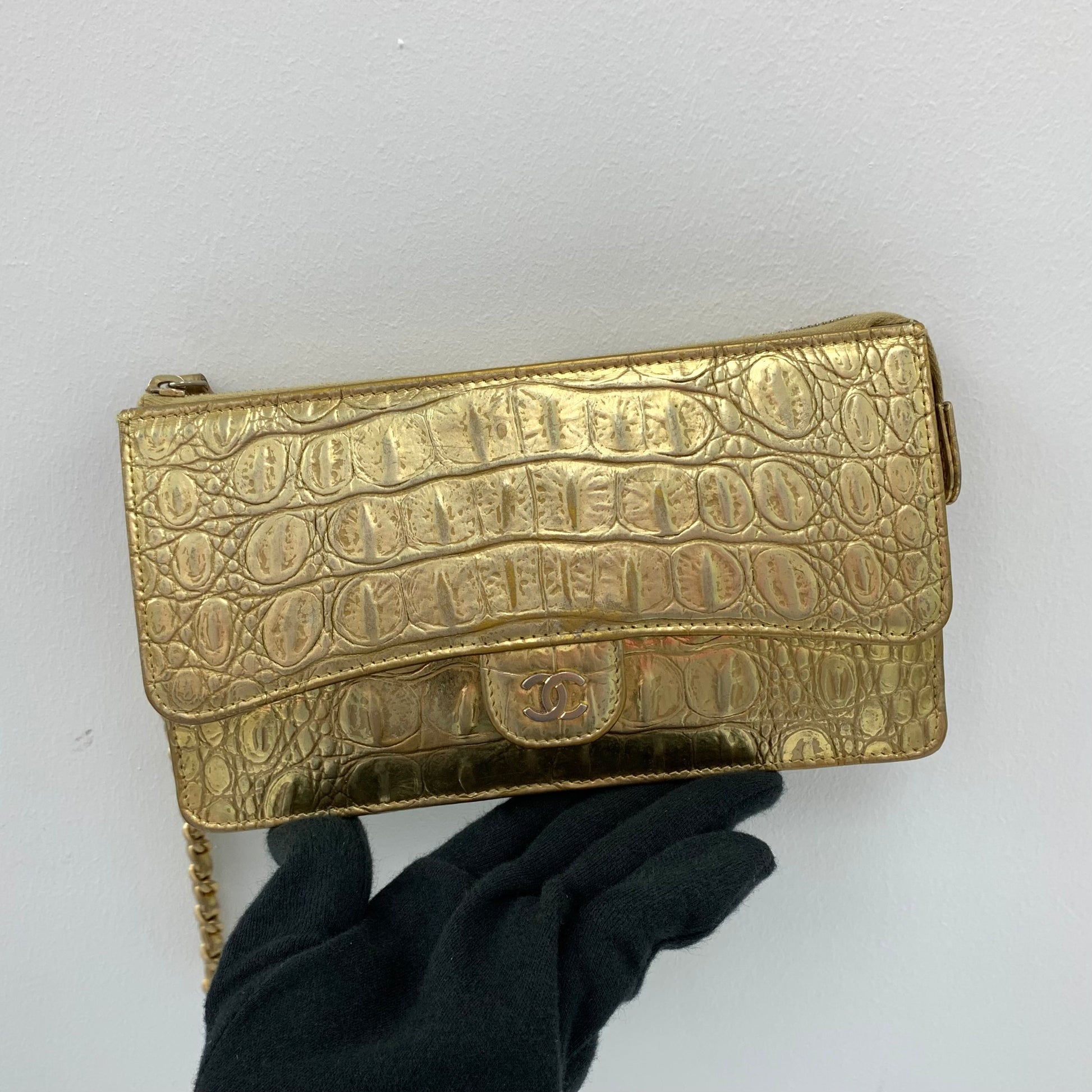 Een opvallende Chanel Long Wallet met Chain Wristlet uit de Métiers d'Art 2018/19 (Pre-Fall) collectie. Deze veelzijdige portemonnee is vervaardigd van metallic geëmbosseerd kalfsleer met een luxueuze gouden glans. Het stuk functioneert zowel als elegante portemonnee als stijlvolle wristlet dankzij de gevlochten leren kettingband.